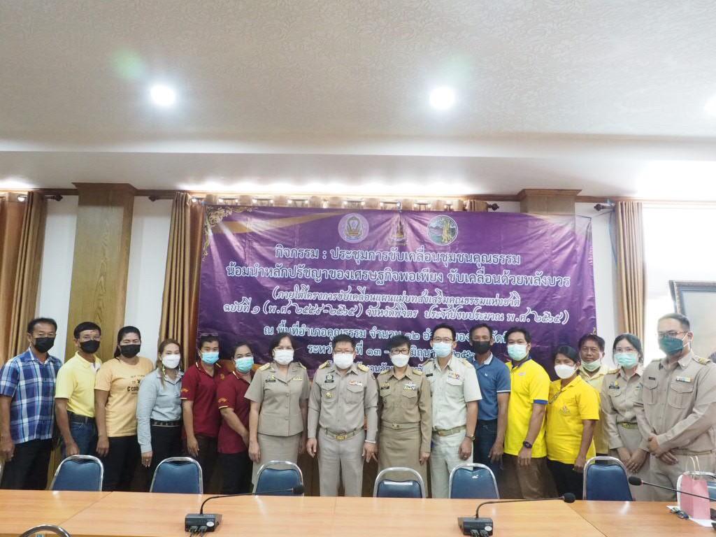 วันจันทร์ที่ ๑๓ มิถุนายน ๒๕๖๕ เวลา ๑๓.๓๐ น. นางสาวพรพรรณ กลิ่นเกษร วัฒนธรรมจังหวัดพิจิตร มอบหมายให้นางฐิฏิยา หาญวีรโยธิน ผู้อำนวยการกลุ่มกิจการพิเศษ พร้อมด้วยบุคลากรสำนักงานวัฒนธรรมจังหวัดพิจิตร เข้าร่วมจัดประชุมขับเคลื่อนชุมชนคุณธรรมน้อมนำหลักปรัชญาของเศรษฐกิจพอเพียง ขับเคลื่อนด้วยพลังบวร อำเภอโพธิ์ประทับช้าง จังหวัดพิจิตร ภายใต้โครงการขับเคลื่อน แผนแม่บทส่งเสริมคุณธรรมแห่งชาติ ฉบับที่ ๑ (พ.ศ. ๒๕๕๙-๒๕๖๕) จังหวัดพิจิตร ณ ที่ว่าการอำเภอโพธิ์ประทับช้าง จังหวัดพิจิตร